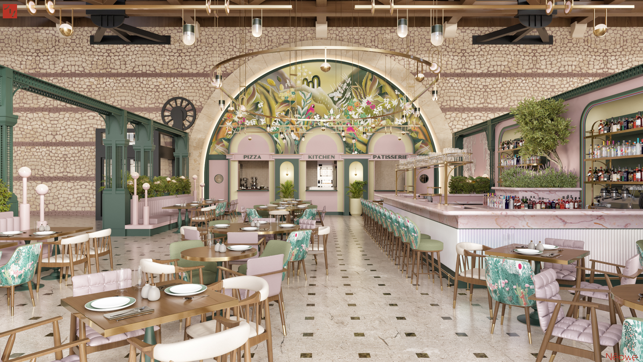 The kitchen and service openings were carefully designed to follow the formal rhythm of the surrounding vaults. These mirrored curves offer visual continuity and structural logic, rooting the new intervention in the architectural language of the past. At the center of the composition, a custom-designed wallpaper beneath the arch creates a bold focal point, guiding the viewer’s eye upward and visually framing the arch’s full span. It celebrates the architectural heritage rather than concealing it — an approach that defines our ethos at Neowe.